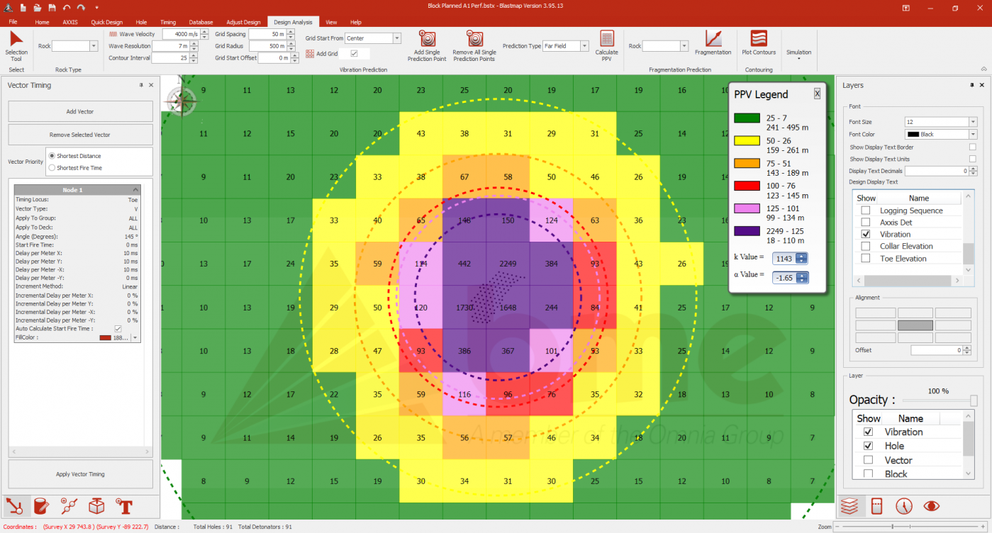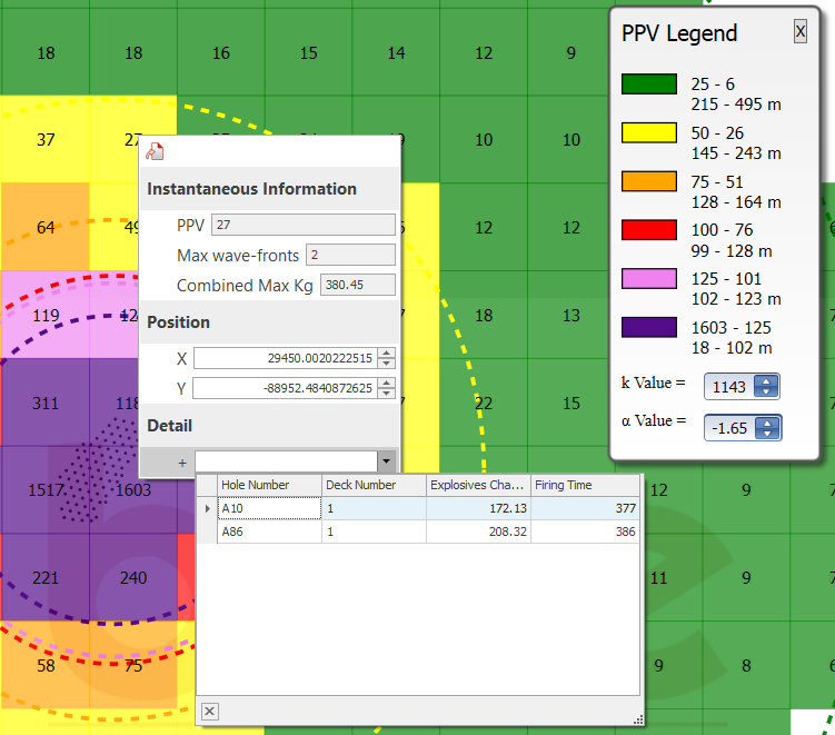 Peak particle velocity prediction can be done on prediction points. These points can be added as a grid or individual points. They can be manually entered or imported from coordinates. Each prediction point will give you a detail summery of the instantaneous information and the ability to change the fire time on the fly
