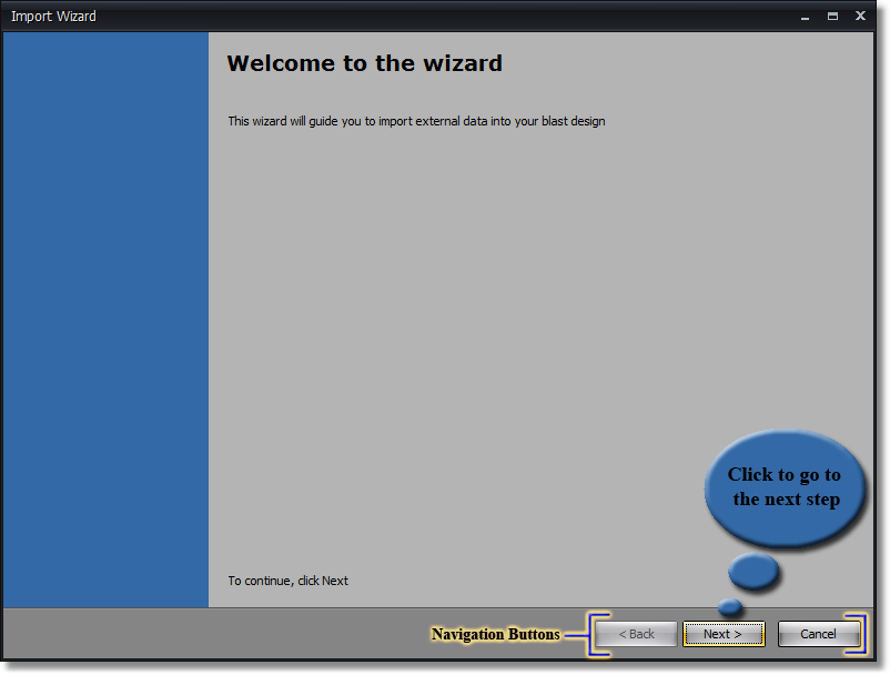 The Import Wizard is a step by step tool that imports objects (Holes, Bench outline points) with coordinates from external text files.