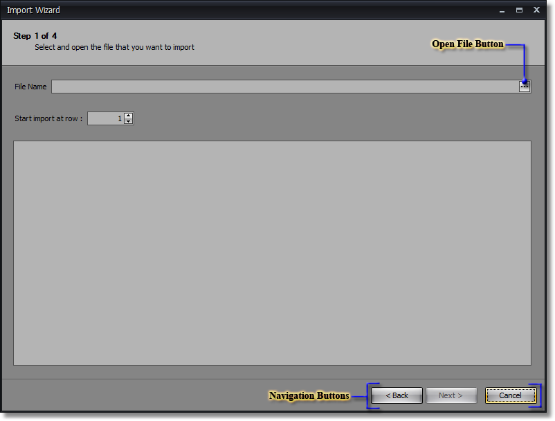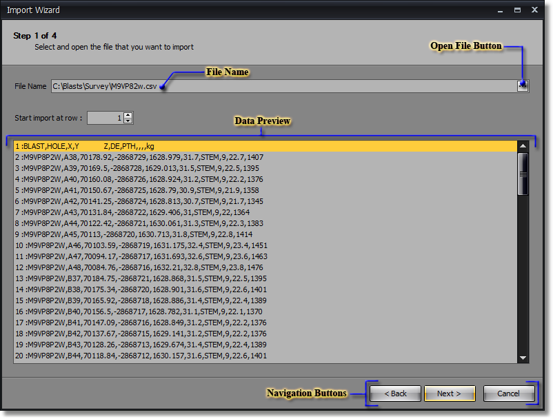 Left-Click on the Open File Button to open the File Open Dialog window. Navigate to the appropriate import file and open it.